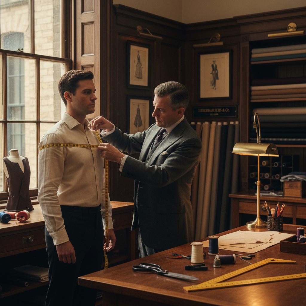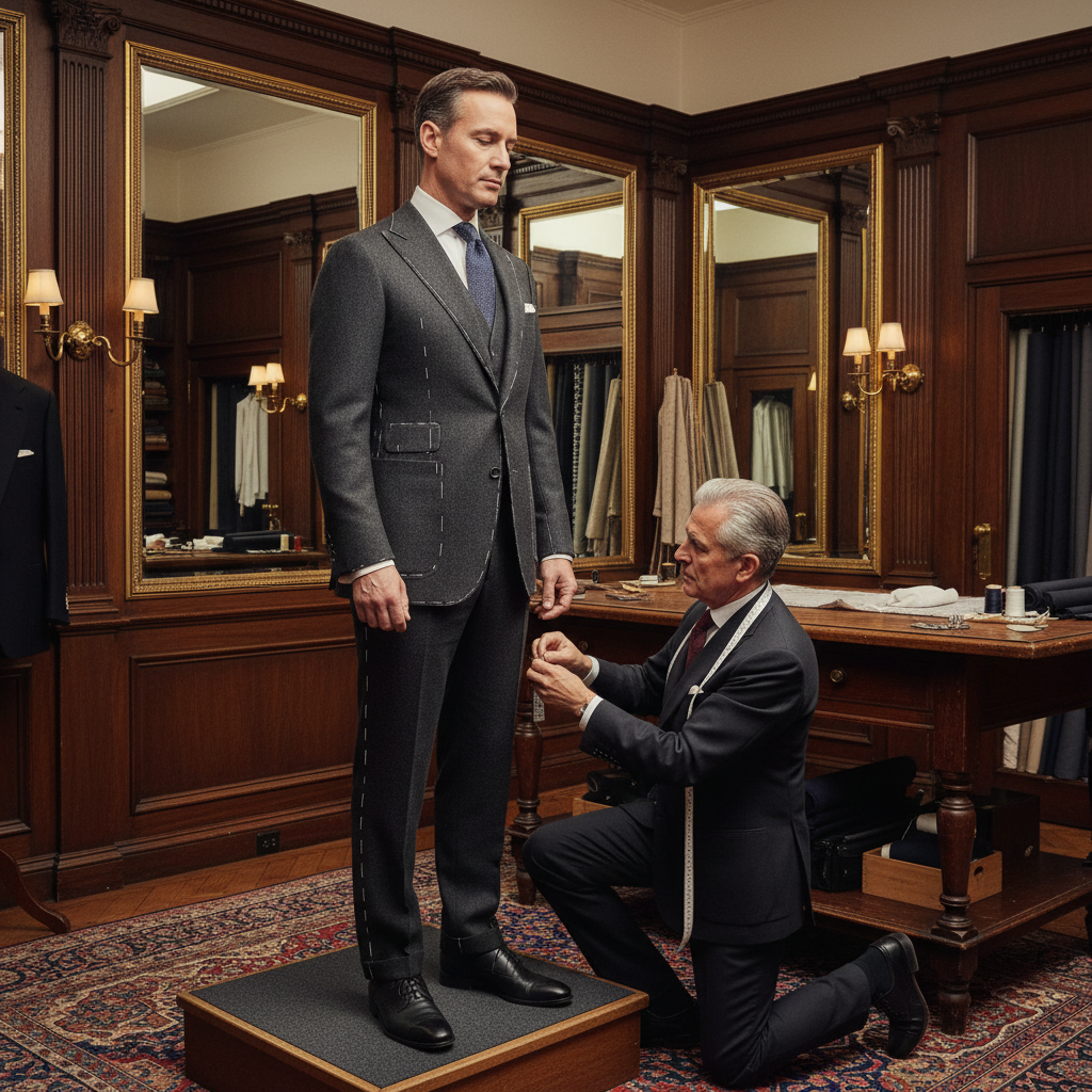 The tailor will take precise measurements of your shoulders, chest, waist, sleeves, trousers, and more, while also observing your posture to ensure the pattern matches your body shape accurately.